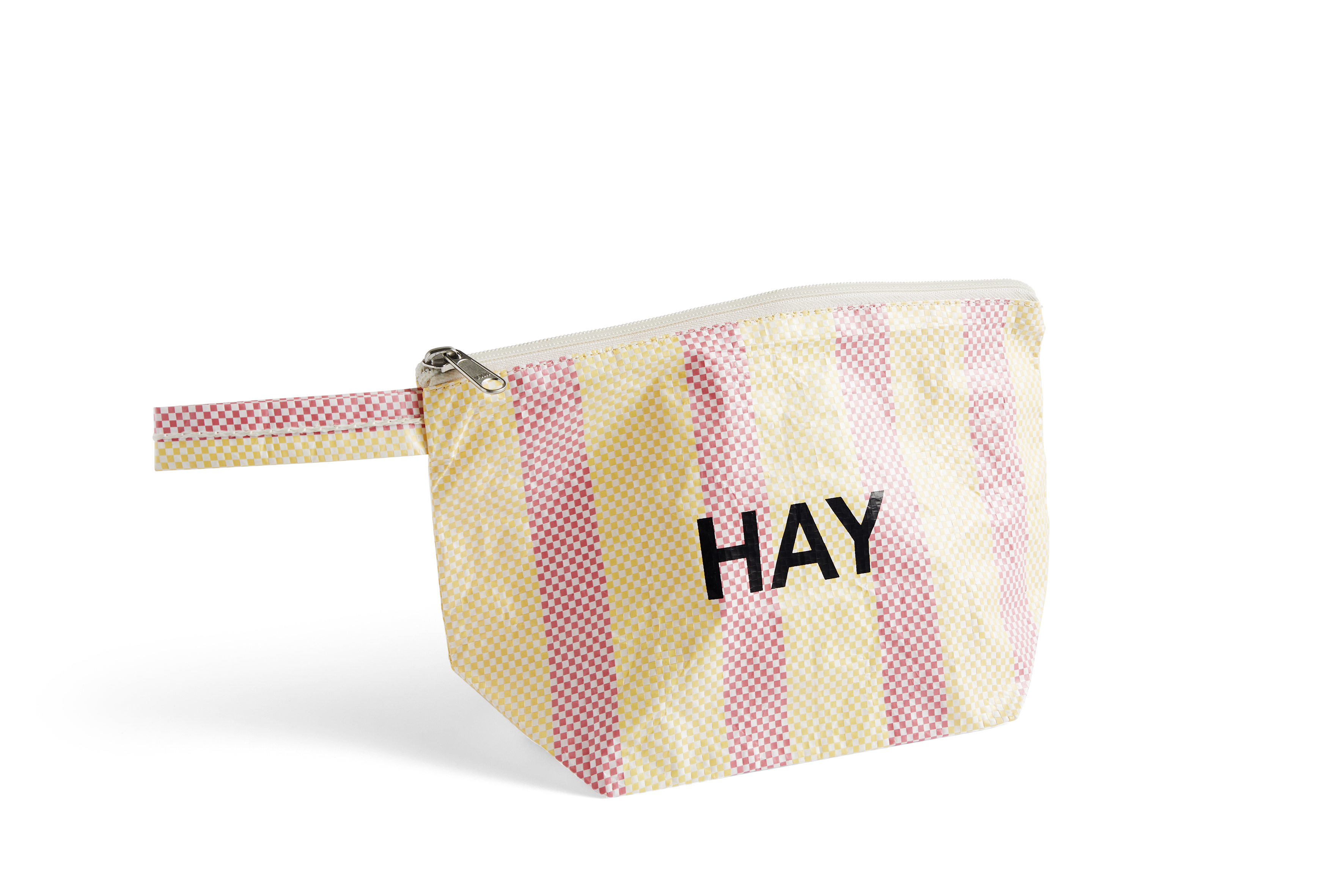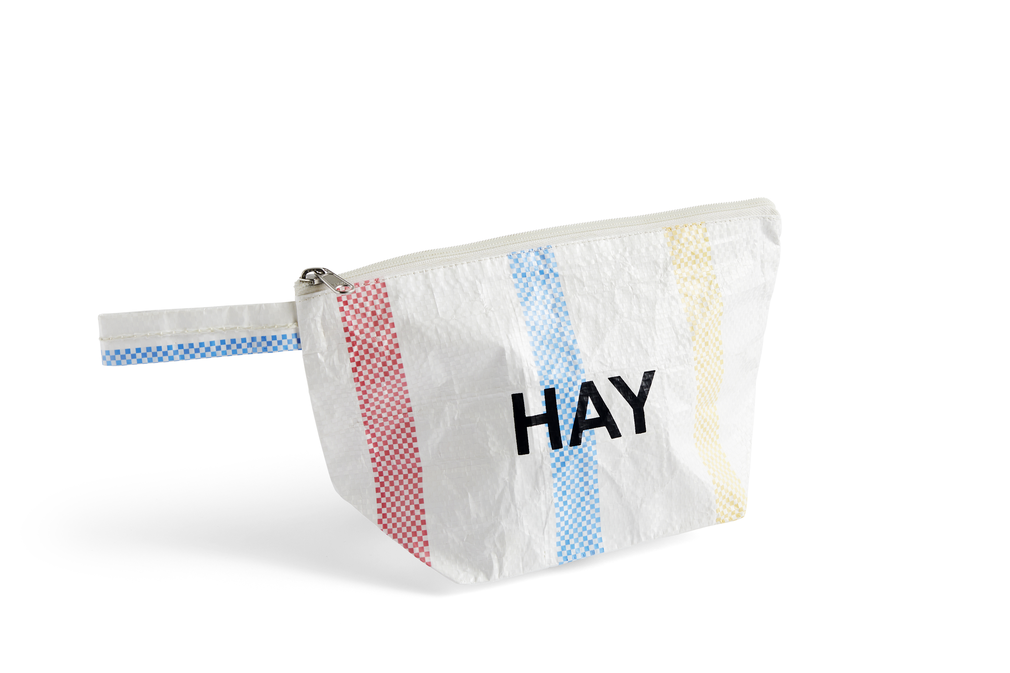 リサイクルプラスチックを80%使用した丈夫で耐久性に優れた防水素材で作られたCANDY STRIPE WASH BAG。化粧品や洗面道具の収納や持ち運びにぴったりの、カラフルで実用的なポーチです。HAYのロゴが効いています。