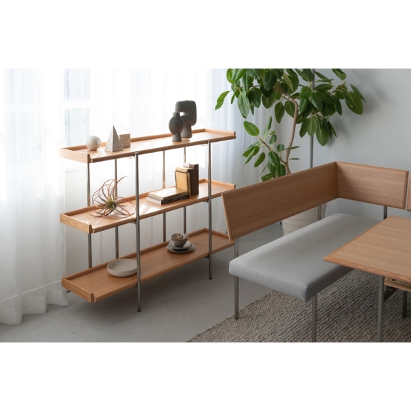 オーク材とステンレスのコントラストがクリーンな印象のリビング収納シリーズ。