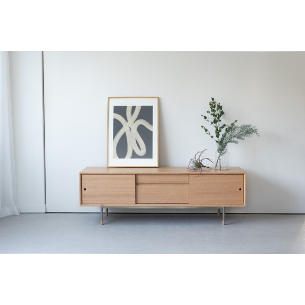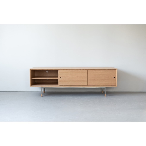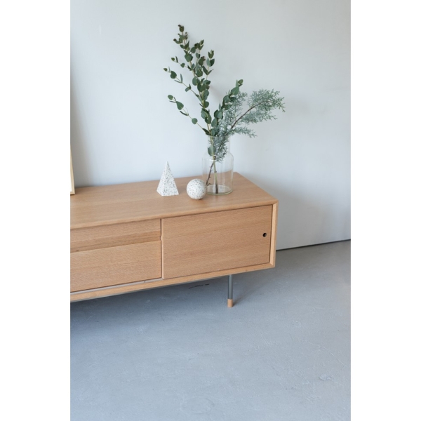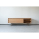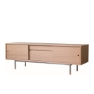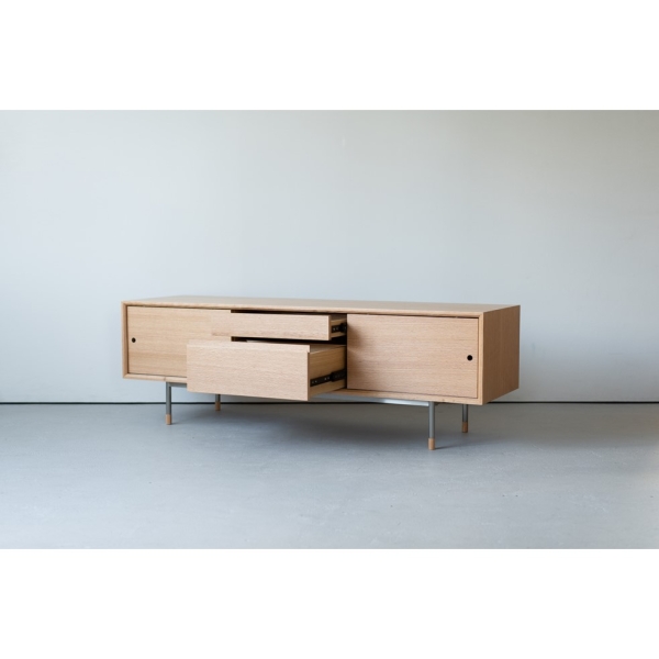 オーク材とステンレスのコントラストがクリーンな印象のリビング収納シリーズ。