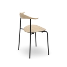 ミニマルなフォルムながら、独特の温かみ持つ、ウェグナーならではのセンスが光る椅子となっています。緩やかな曲線を描く楕円形の木製の座面や曲木材を用いた背もたれ。それとは対照的な直線的なスチール製のフレームで支えられています。また、背もたれの先端は自然に肘を置くことを考慮した、機能的な形状となっています。