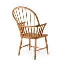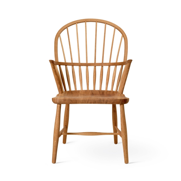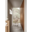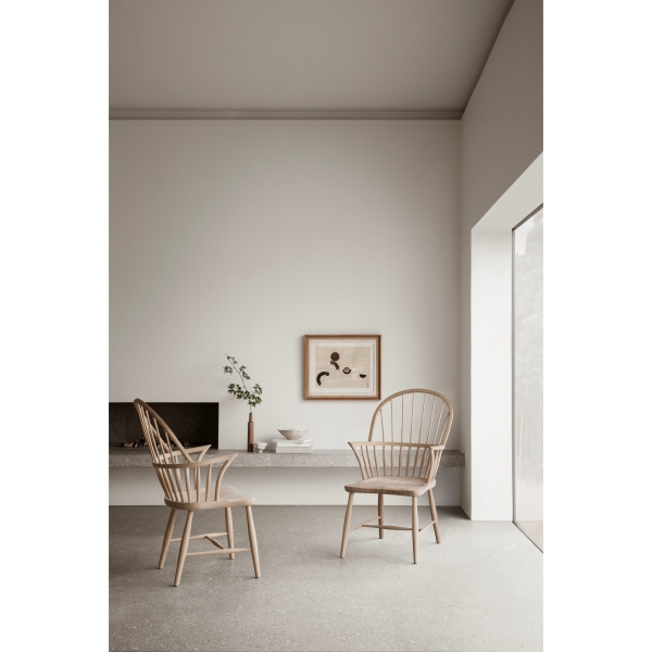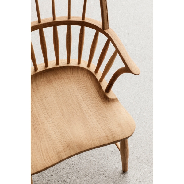 FSC™認証の無垢のオーク材を精巧に形作り、手作業でサンディングを行ったハイバックチェアは、ダイニングチェアとラウンジチェアが融合したデザインです。