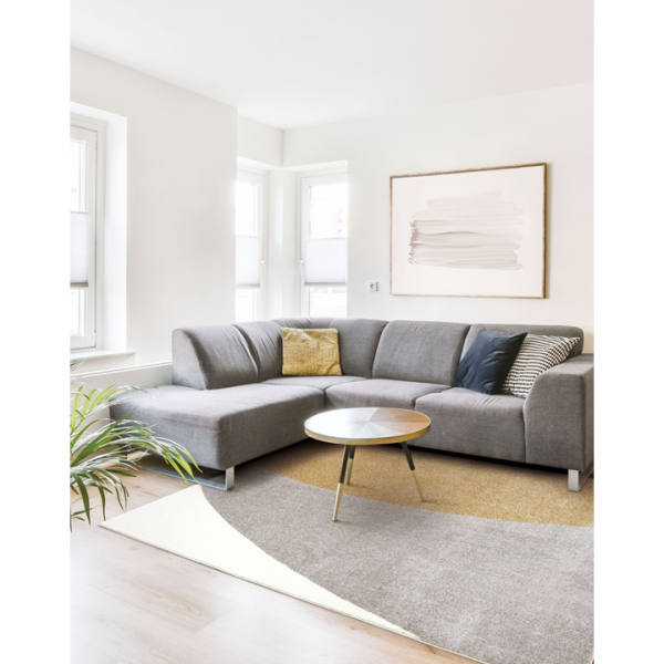 ゆるやかなカーブが描く大胆なストライプパターンと温かみのある配色がモダンなラグは、インテリアのアクセントになります。